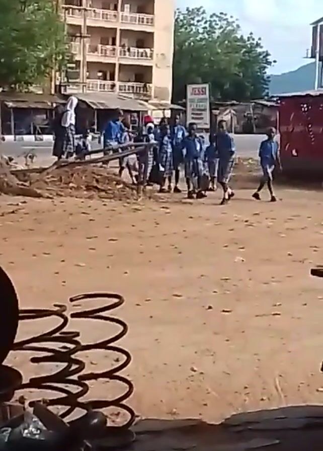 group of school children walking on a dirt road. They are wearing blue and white uniforms. There is a building in the background and a sign that says "JESSI". In the foreground there are some car springs. The children are walking in a group.