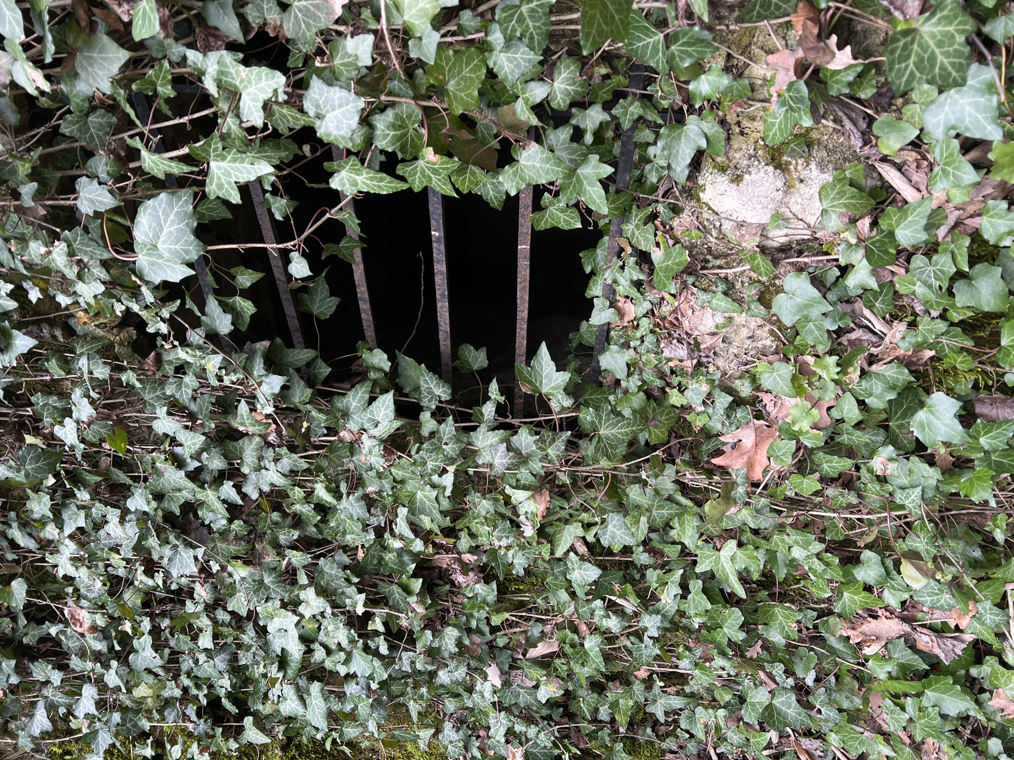 - "A slightly angled, high-angle shot shows a metal grate, largely obscured by dense ivy, set into a surface of stone and earth" by FM-SHO9l2, licensed under CC BY 4.0