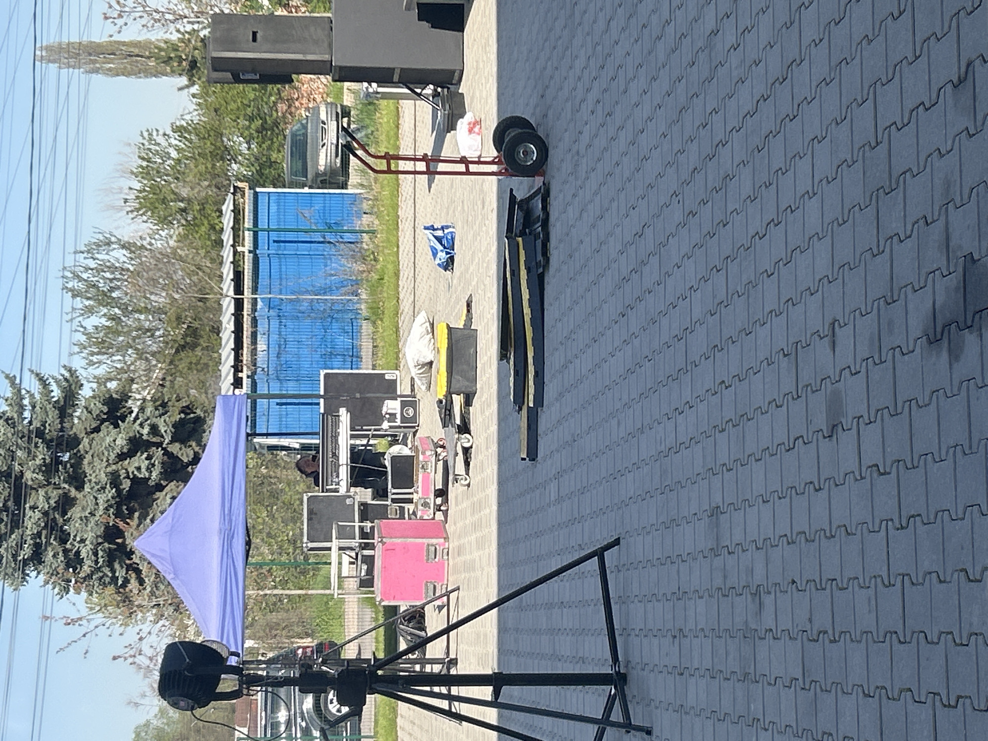 staging area, potentially for an event or performance, located outside in what appears to be a parking lot or similar paved area. Various pieces of equipment are present, including speakers, a stage lighting fixture on a tripod, a blue temporary shelter or awning, and numerous cases and containers for equipment, one of which is notably pink. A hand truck or dolly is visible near some of the larger speaker cabinets. In the background, a blue portable toilet structure is seen, along with trees and a partial view of a car. The location is described as being in German, Bulgaria. The weather appears to be clear and sunny. There are no visible people interacting with the equipment in the frame.