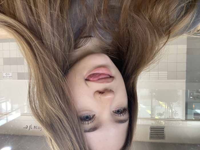 A young female, appearing to be in her late teens or early twenties, with light brown hair and light blue eyes, is centrally positioned and visible from the chest up. She wears a small ring piercing in her right nostril. Her head is slightly tilted to her left, and she has extended her tongue to touch her upper lip. She is wearing a grey hooded garment. The background reveals an indoor public space, characterized by large glass panels reflecting ambient light and indistinct outdoor foliage. A rectangular ventilation grate is present on the upper left wall. The lower portion of the wall features white rectangular tiles. On the right side of the background, two signs with Hebrew text are visible: one above reads "יש לך מכחול" (You have a brush), and below it, "מרחב מוגן" (Protected Area) with an accompanying right-pointing arrow. This sign indicates the location as a public building within Raanana, Israel.