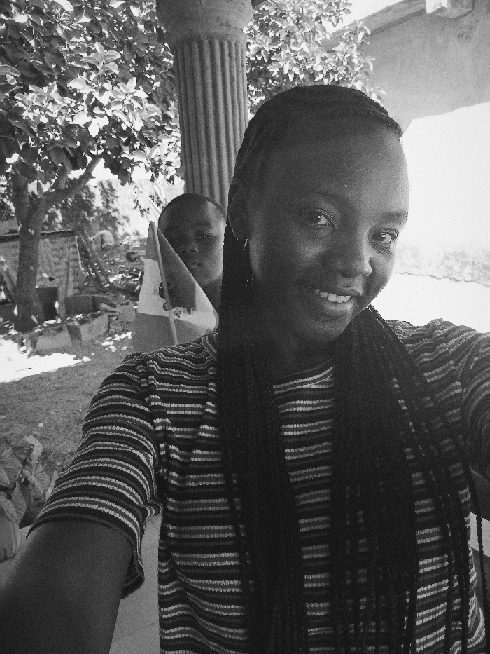 A black and white photograph depicts two individuals in an outdoor setting. In the foreground, a young woman with dark skin and long braided hair smiles directly at the camera. She wears a horizontally striped short-sleeved top. Her right arm is visible, bent at the elbow, suggesting she is holding the camera. Behind her, partially obscured by her head and a triangular object, a child with dark skin looks towards the camera, holding a small, light-colored flag or banner. The background features a fluted column to the left of the woman's head, dense tree foliage, and an unpaved or dirt ground surface. Distant structures, including what appear to be makeshift shelters or constructions, are visible further back on the left, under bright sunlight. The location is an unspecified outdoor area in the city of Unknown, Unknown.
