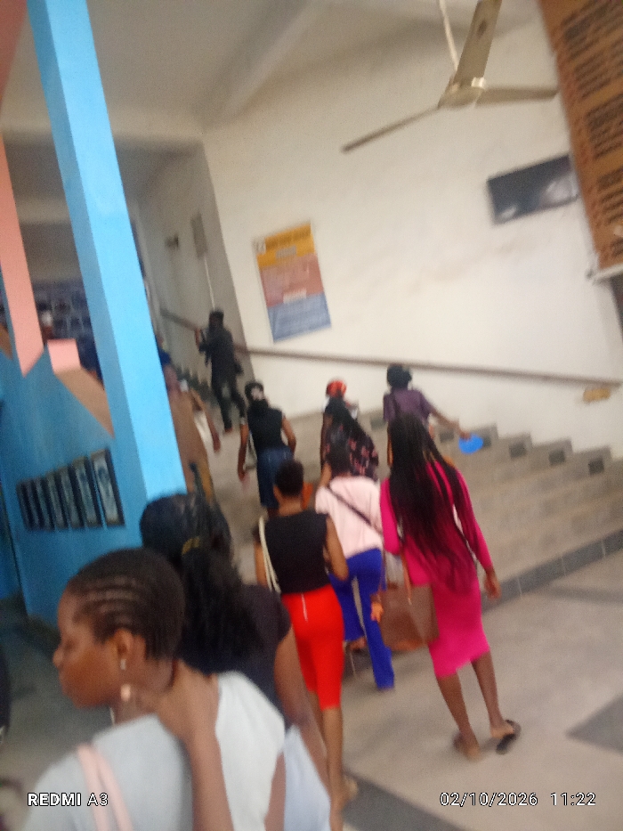 People are walking up a staircase indoors. Some are wearing face masks. A woman in a bright pink dress and another in red pants are prominent. A ceiling fan and signs are visible in the background. The date 02/10/2026 is imprinted at the bottom.