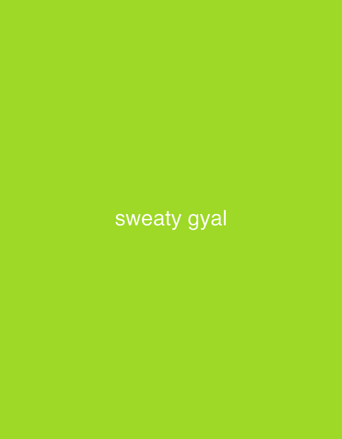 The image displays a solid, uniform lime green background. Centered horizontally and vertically on this background are the words "sweaty gyal" in plain white, sans-serif text. No people, specific objects, actions, or interactions are visible. The environment is an abstract digital background. There are no discernible visual elements within the image to indicate a specific location in Tonbridge and Malling, United Kingdom, or any other geographical area.