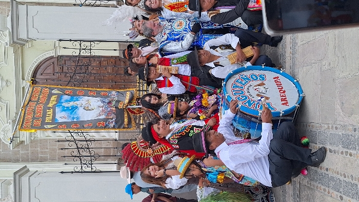 A group poses in front of a building with a banner that reads "Conjunto Sicuris Del Barrio Mazzo, Filial Arequipa"