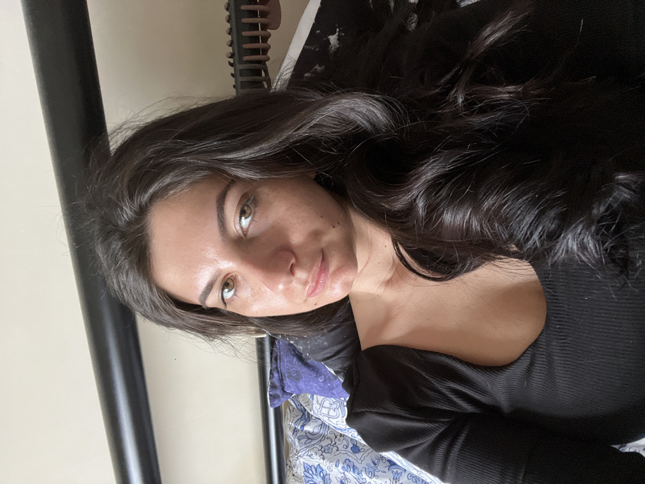 A close-up portrait depicts a female subject reclining in what appears to be a bedroom within the city of Unknown, Unknown. The woman has long, dark brown, wavy hair that cascades over her right shoulder and chest. She possesses greenish-brown eyes and a neutral, direct gaze towards the camera. She is clad in a dark, possibly black, ribbed long-sleeved top featuring a scoop neckline. The immediate background behind her head consists of a black metal headboard. To the subject's left, a pillow with a white and blue patterned pillowcase is visible. To her right, dark patterned bedding is present, along with a partially obscured brown wooden object exhibiting vertical prongs or slats. A light-colored wall is visible above the headboard. No active interactions or specific actions are depicted beyond the subject posing for the photograph.