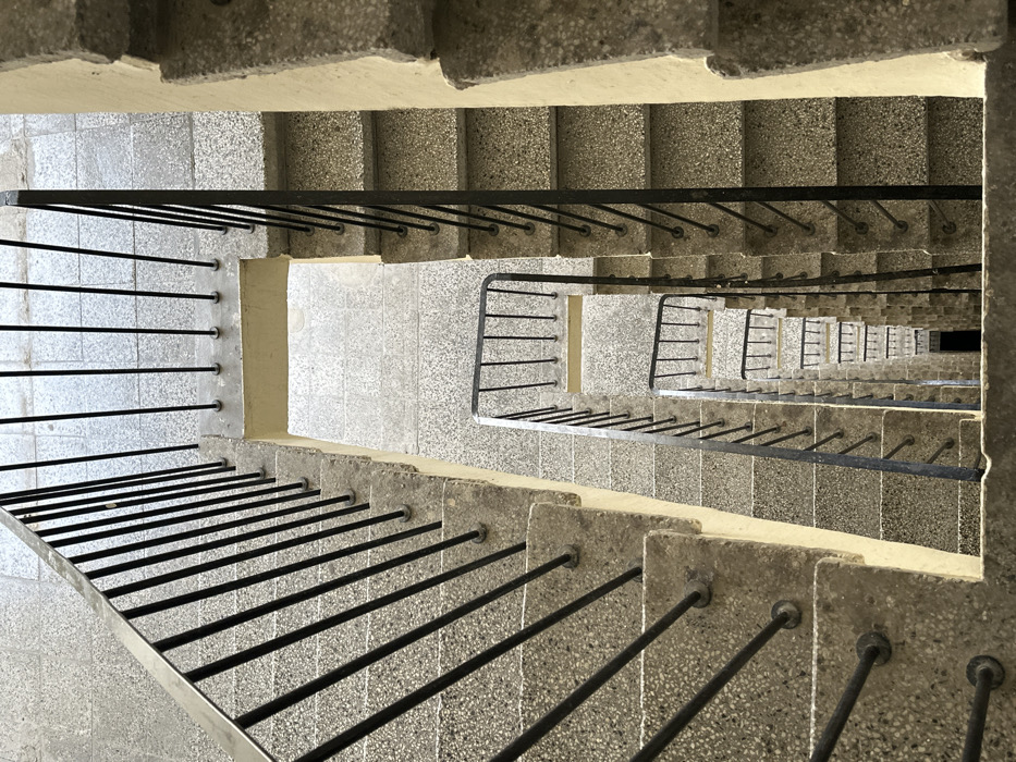 - "The image presents a top-down view into a multi-story stairwell within a building located in Varna, Bulgaria" by FM-RPxQW2, licensed under CC BY 4.0
