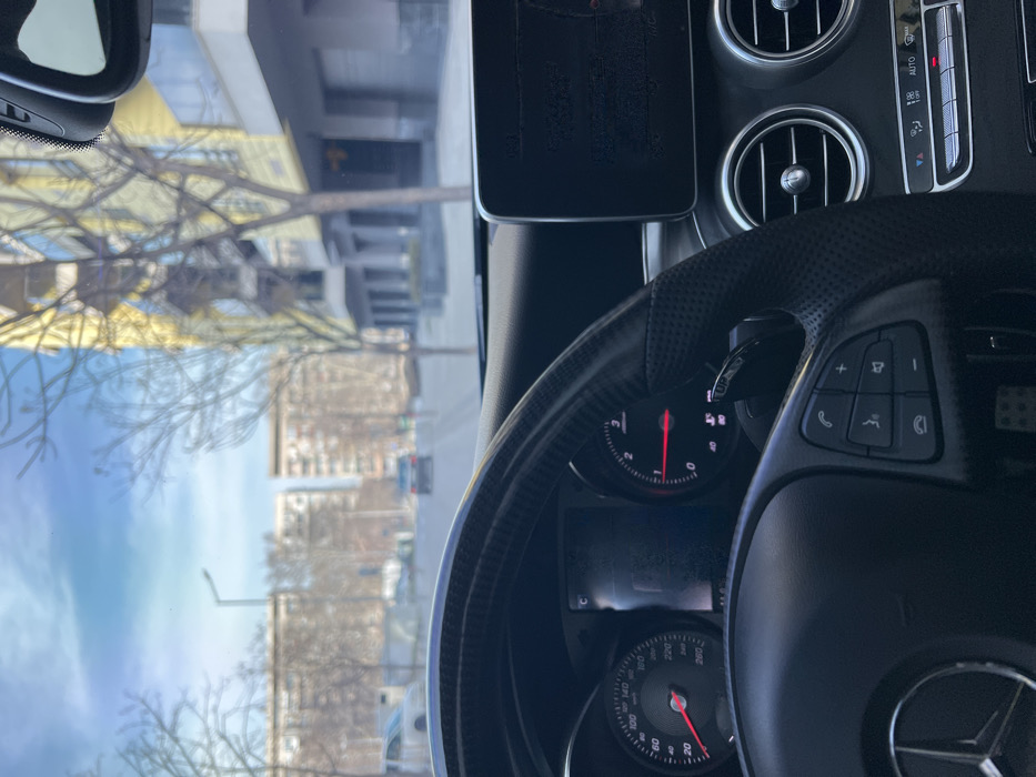 The scene depicts an urban street in Plovdiv, Bulgaria, viewed from the driver's perspective inside a Mercedes-Benz vehicle. The foreground displays the vehicle's interior: a black leather-wrapped steering wheel with the Mercedes-Benz logo and integrated controls, the instrument cluster showing both speedometer and tachometer needles at zero, and a digital infotainment screen on the dashboard to the right. Circular air vents are also visible on the right side of the dashboard. Outside the windshield, an asphalt road extends into the distance under a clear blue sky. Multi-story buildings line the street; a building with a yellow facade and balconies occupies the immediate right, appearing to have commercial units on the ground floor. Further down the street, additional residential-style buildings are visible on both sides. Bare-branched deciduous trees are interspersed along the sidewalks. A single street light pole is visible on the left side of the road in the middle distance. Two distant vehicles are present on the road: a light-colored sedan on the left and a darker sedan positioned further ahead in the center. The vehicle from which the photo is taken appears stationary.