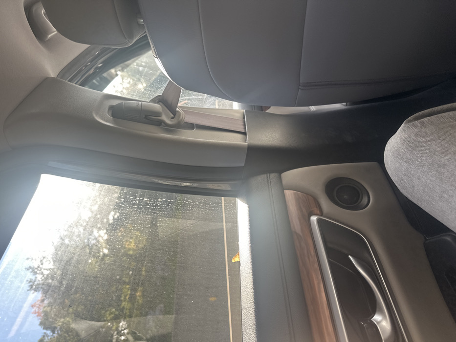 The image depicts the interior of a vehicle, viewed from a rear passenger's perspective, looking towards the front passenger side window and exterior