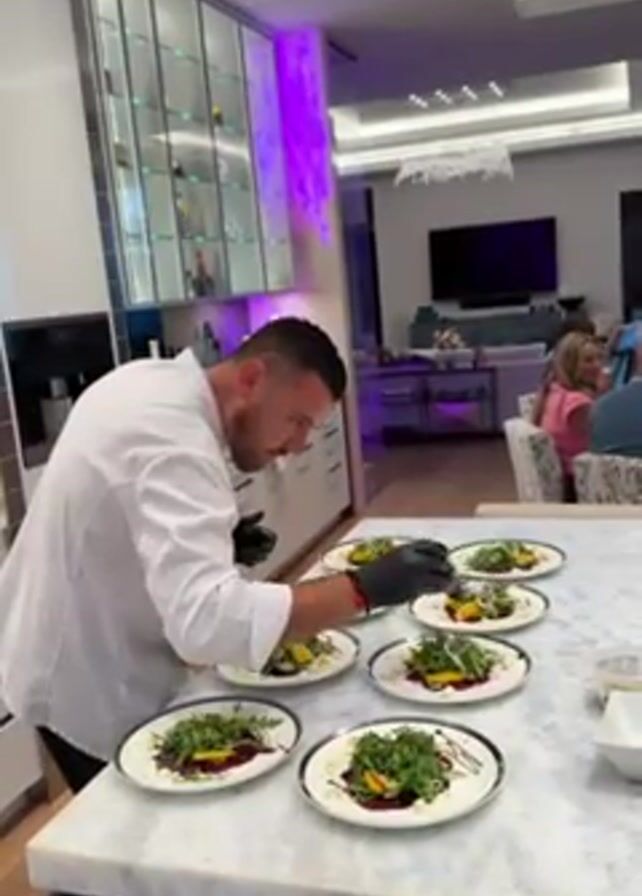 A male chef in a white chef's coat and black gloves is preparing plates of food on a marble countertop in a modern kitchen. The plates contain a mixture of greens, yellow cubes, and red sauce. The chef is focused on adding a final touch to each plate. Behind the chef, there's a glass-fronted cabinet illuminated with a purple light, displaying bottles and other items. In the background, people are seated at a dining table, and a television is visible on the wall. The overall impression is a high-end, modern home where a private chef is preparing a meal.