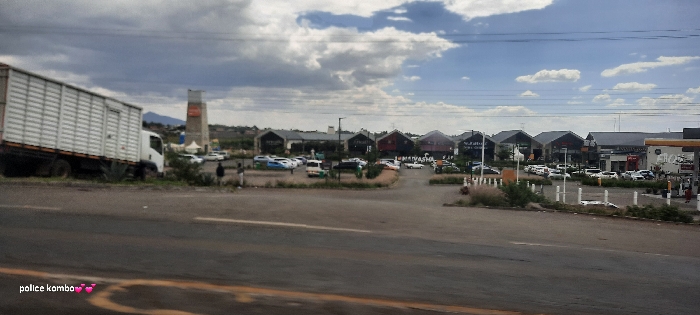 A wide, curving road leads to a complex of low, gabled-roof buildings, some with signs visible, like "NAIVASHA" and "CAFE/SHOP." Many cars are parked. A tall tower stands near the complex, with a large transport truck parked alongside the road in the foreground. A Shell petrol station is on the right side of the image. The sky is partly cloudy. "police komba" is written in the bottom left corner.