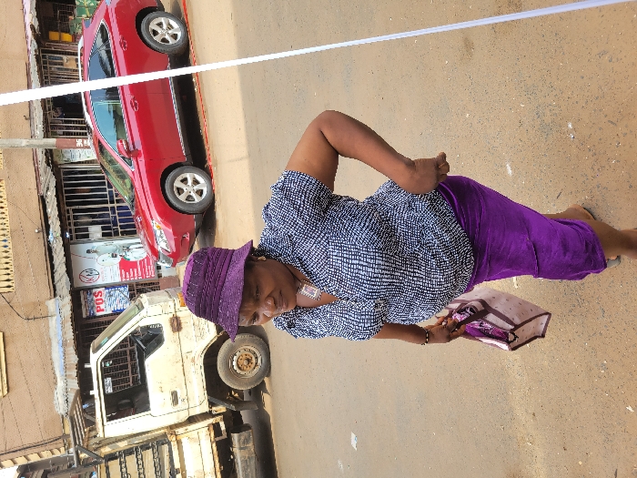 The image portrays a daytime urban street scene in Onitsha, Nigeria. An adult female is prominently featured in the lower center, walking towards the viewer's right. She wears a dark purple bucket hat, a white and dark geometric-patterned short-sleeved blouse, a knee-length dark purple velvet skirt, and light-colored flip-flops. A rectangular pendant hangs from her neck, and a bracelet adorns her left wrist. She carries a clear tote bag with purple trim in her left hand, while her right hand is positioned near her hip, seemingly adjusting her skirt. In the background, a cream-colored flatbed truck is parked on the left, partially obscured. To the right, a red Lexus RX SUV is parked parallel to the street. Behind these vehicles, a row of commercial buildings lines the street, featuring metal security grilles over windows and doors. Visible signage includes a red and white sign displaying "POS" and another red sign with a "KM" logo depicting a person on a scooter, along with the address number "36." The street surface is composed of worn asphalt and dirt, indicative of a dusty urban environment. Above the single-story shops, a portion of a multi-story building with a brown-tiled facade is visible. A thin white vertical line, likely a utility cable or pole, extends along the right edge of the frame.