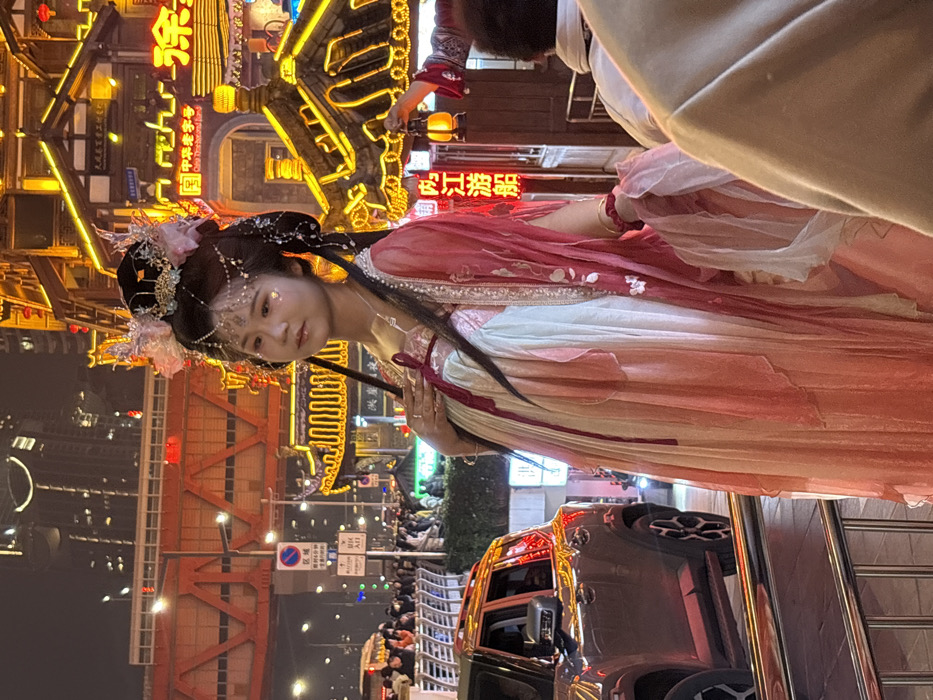 This image captures a nighttime urban scene in Yuzhong District, China. A young East Asian female stands centrally, posing while looking towards the viewer with a slight smile. She wears a layered traditional Chinese dress featuring gradient shades of red, pink, and light blue/white. Her hair is styled in an elaborate updo adorned with a dark, ornate crown, floral embellishments, and a jeweled forehead chain; gold glitter is present on her upper cheeks. Her left hand rests over her chest, and her right hand holds a fold of her garment. To the subject's left, a dark-colored SUV with illuminated red taillights is visible on a street, behind a metal railing in the foreground. In the background, brightly lit, multi-story buildings with traditional Chinese architectural elements are prominent, featuring numerous yellow and orange lights and signs with Chinese characters, including "中国老字号" (China Time-honored Brand) and "内江游船" (Neijiang Cruise Boat). A large, red-painted metal truss bridge is visible in the upper-left background, above a crowded street. Numerous indistinct pedestrians occupy the mid-ground. A partial view of a person wearing a light-colored top is visible in the lower right foreground, and an arm holding a lit traditional lantern extends from the middle-right background. The entire scene is illuminated by diverse artificial light sources.