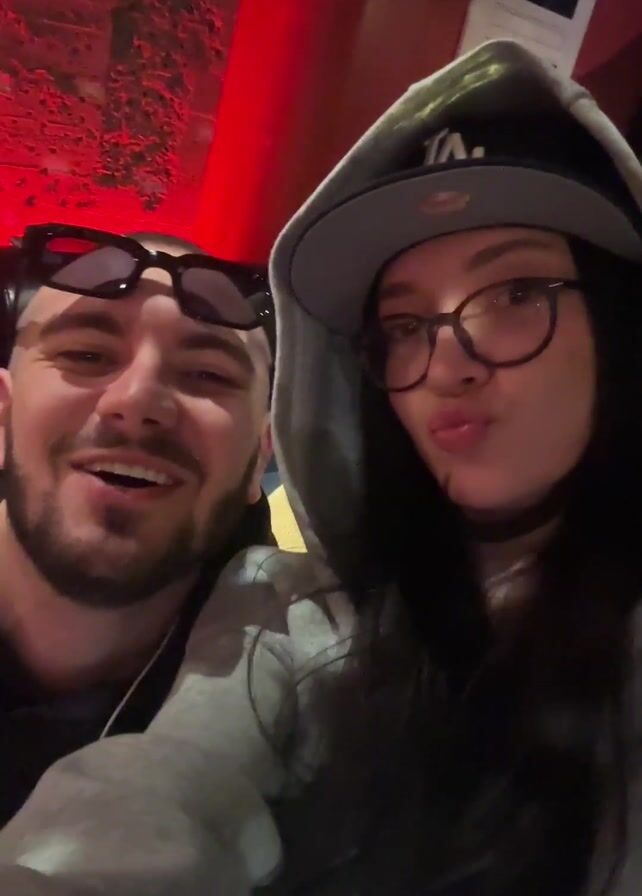 A man and a woman take a selfie. The man has brown hair and a beard and is wearing sunglasses. The woman has long black hair, glasses, a baseball cap under the hood of a grey hoodie, and a choker. They both smile. The background is red.
