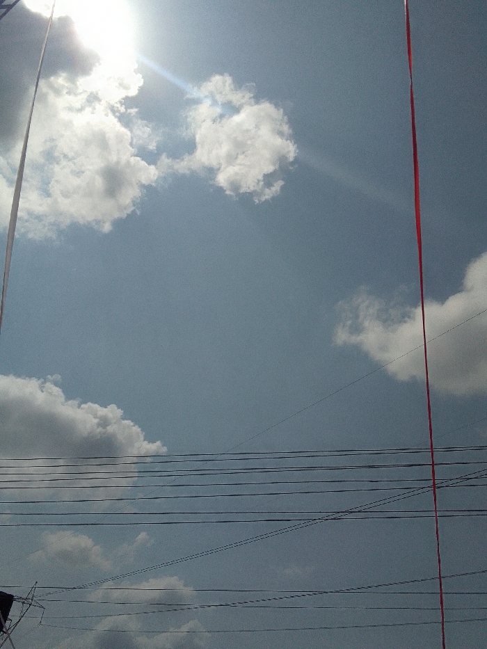 The scene depicts an outdoor environment in the city of Unknown, Unknown, primarily featuring the sky. The sky is light blue with scattered white cumulus clouds. The sun is visible in the upper-left quadrant, partially obscured by a cloud, creating a bright lens flare that extends diagonally across the upper portion of the frame. A light-colored vertical pole or cable runs along the far left edge of the image, extending downwards from the top. On the far right, a thin, vertical red ribbon or strip descends from the top edge, extending approximately two-thirds down the frame. Numerous dark, parallel utility wires are stretched horizontally across the lower half of the image. A dark, angular structure, possibly part of a utility pole or antenna, is partially visible in the bottom-left corner. No people or animals are present. The time of day is daylight.