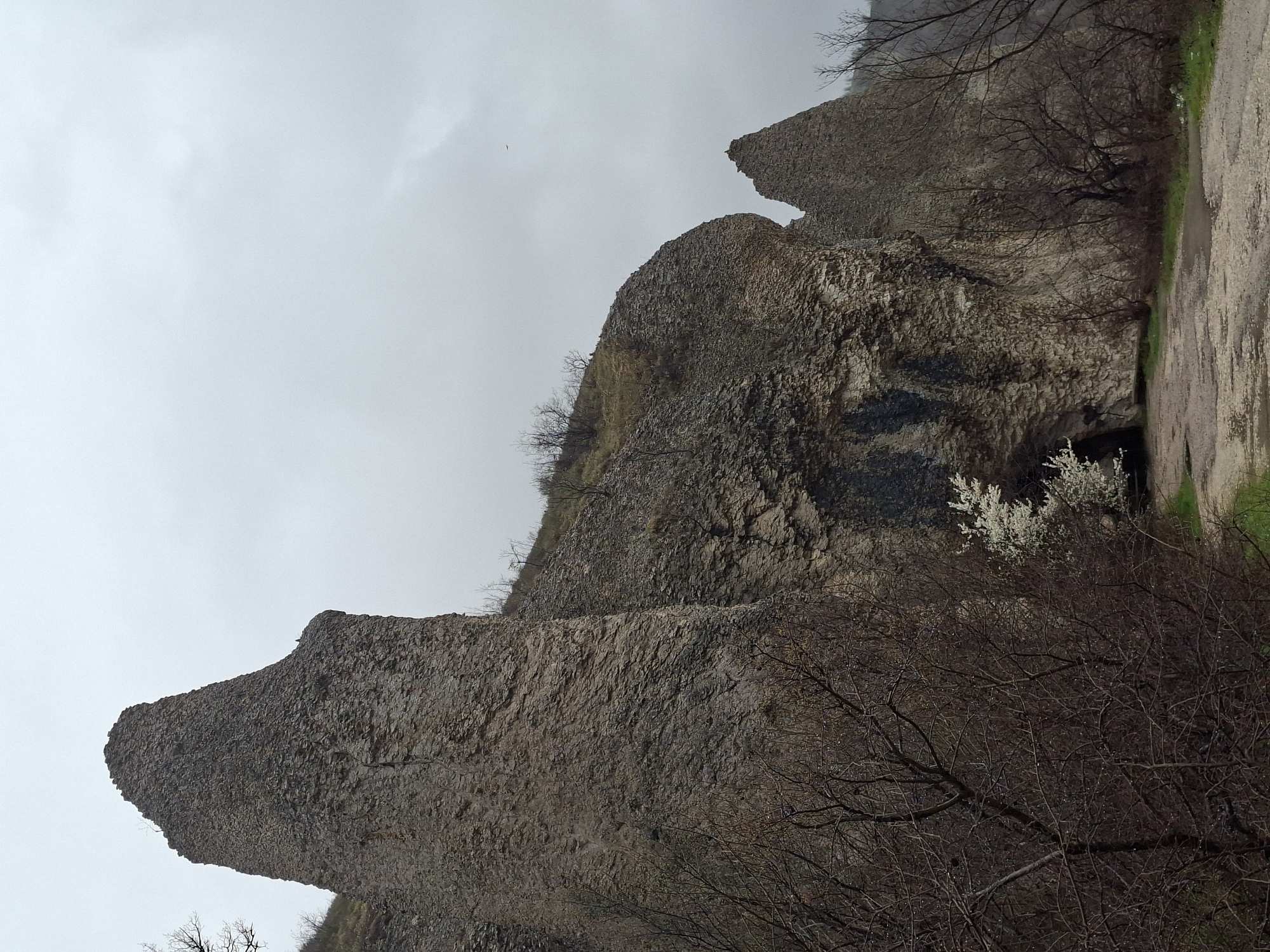 natural rock formation with distinct, steep sides, reminiscent of cliffs or towers. The rocks are gray and textured, with visible cracks and small vegetation clinging to the surface. A narrow path runs along the base of the formation, and bare trees and shrubs surround the rocks. The sky is overcast, casting a flat, diffuse light on the scene. The location is likely near Asparuhovo, Bulgaria, given the prompt's specification.