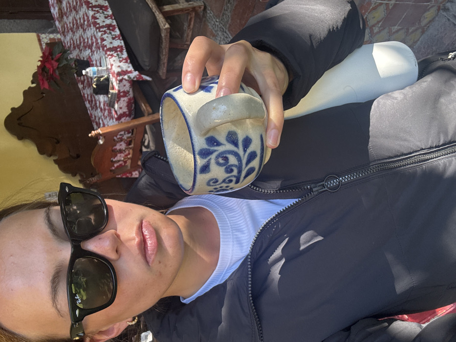 A female subject is presented in a medium-close shot within an outdoor or semi-outdoor patio setting, identified as being in San Juan del Río, Mexico. She wears black Ray-Ban Wayfarer-style sunglasses, a white ribbed crew-neck t-shirt, and a black puffy jacket with a visible zipper and circular pull tab. A small gold-colored hoop earring is visible in her left ear. Her lips are slightly parted. Her right hand holds a light-colored ceramic mug adorned with blue floral-scroll patterns. In the background, to the subject's right, a wooden table is covered with a white tablecloth featuring a red floral design. On the table, a small potted poinsettia plant, a plastic water bottle, and a dark object are visible. Behind the table, a carved wooden chair with a dark cushion and an ornate, dark wooden wall fixture are present. Strong sunlight illuminates the scene, creating distinct shadows. The immediate ground visible is tiled.