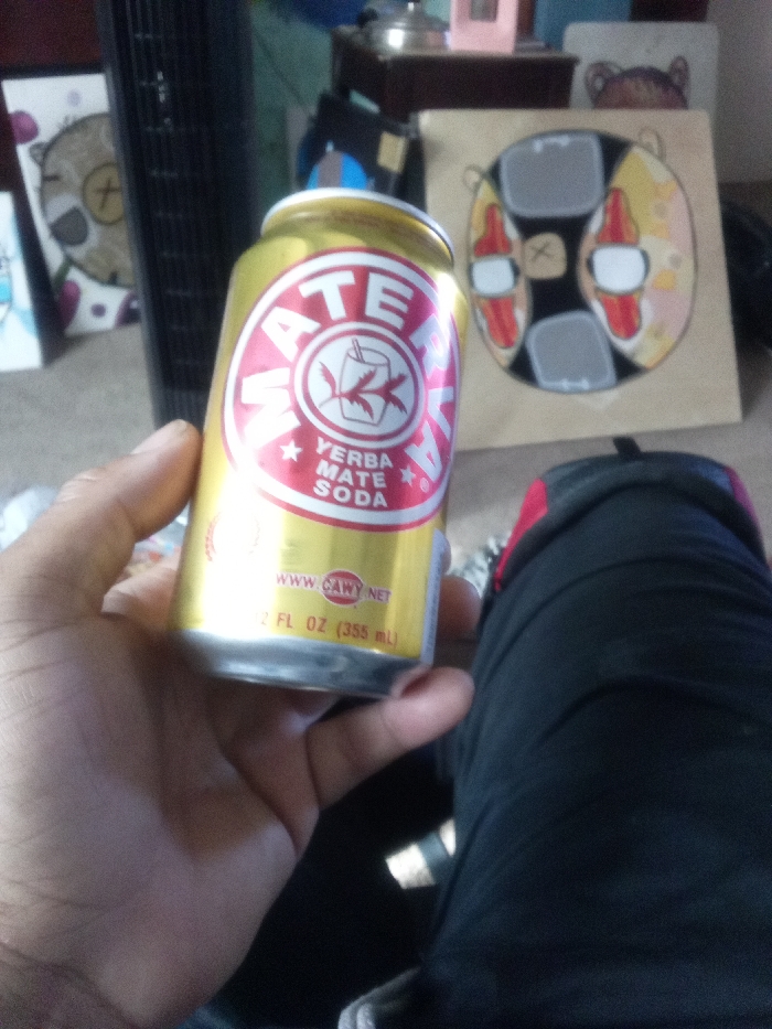 - "A medium-dark skinned right hand holds a gold-colored aluminum can of "MATE Yerba Mate Soda" in a domestic indoor setting" by FM-Hjusx2, licensed under CC BY 4.0
