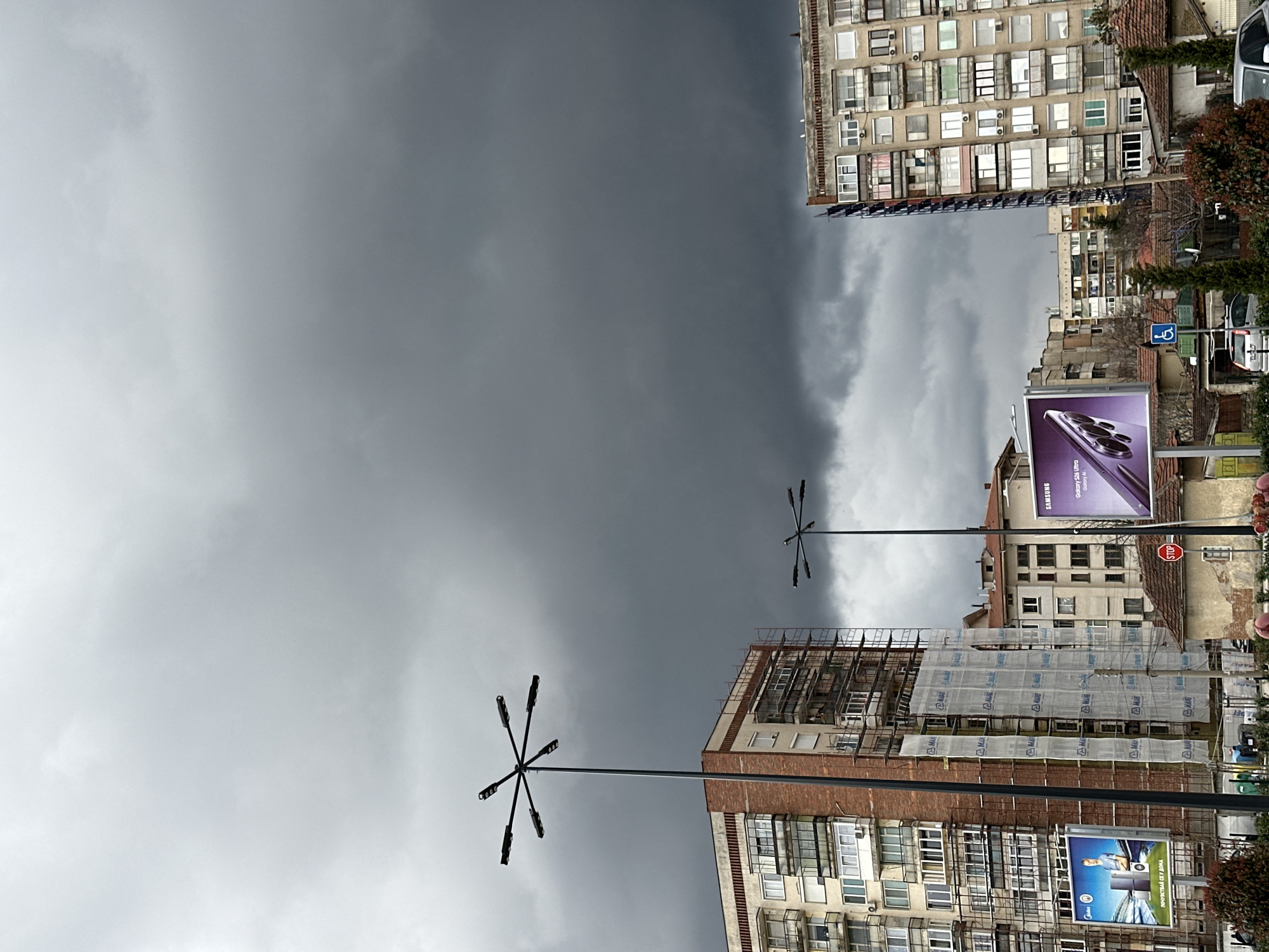 The image presents an urban landscape in Lovech, Bulgaria, under a heavily overcast sky dominated by dark gray storm clouds. Two black, multi-arm streetlights, each with six radially arranged light fixtures, stand centrally in the frame. On the left, a multi-story residential building with a light-colored facade and a section of exposed red brick is undergoing renovation, evidenced by extensive metal scaffolding partially covered with white protective sheeting bearing the "Mapei" logo. Below this, a large rectangular billboard displays an advertisement for Midea appliances, featuring a male figure and a refrigerator. To the right, a taller, multi-story concrete residential building, characterized by numerous windows and enclosed balconies, stands against the dark sky. In the mid-ground, a second, identical streetlight is visible. Below this, another large billboard exhibits an advertisement for a Samsung Galaxy S24 Ultra smartphone, displaying a purple device. Between these main buildings, a small, single-story light-brown structure is visible, with a red octagonal "STOP" sign affixed to a pole in front of it. A blue square sign with a white wheelchair symbol is also present. In the lower right background, several vehicles, including a silver car, are partially visible. The foreground features green and reddish shrubs. No discernible people are prominently featured.