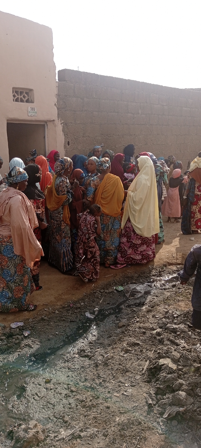 group of people, mostly women, gathered in front of a building in Panshekara, Nigeria (latitude: 11