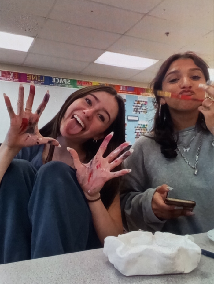The image displays two young females in an indoor setting, consistent with an art classroom or studio