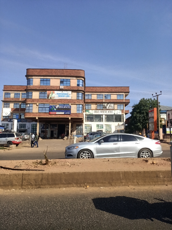 The image depicts a daytime street scene in the city of Unknown, Unknown. A multi-story commercial building, constructed with a light brown/orange facade and blue-tinted windows, dominates the background. The building features a prominent central section with rounded corners. Visible signage on the building includes "EMPOWERED GOOD LIFE" on an upper floor and "PHILBASS" and "LUGGAGE FURNITURE WORLD" on lower floors. In the mid-ground, a silver Ford Fusion sedan is parked or stopped parallel to the street, partially obscuring the building's lower level. To the left, a light-colored SUV with a roof rack is partially visible. Two men are walking on the paved area in front of the building, moving leftwards. Additional indistinct figures are present near the building's entrance. The foreground consists of an asphalt road surface, marked with a dark shadow on the lower right, and a dirt median strip with sparse vegetation. A utility pole with wires and green foliage from trees are visible on the right side of the frame. The sky above is clear and blue.