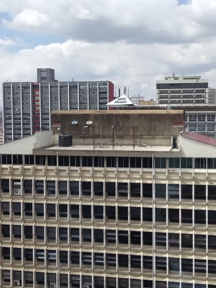The image presents an elevated view of an urban cityscape in Nairobi, Kenya, under a partially cloudy sky. In the foreground, the upper floors of a building with a light-colored, gridded facade are visible, featuring numerous dark-tinted windows, some with horizontal louvered blinds. Multiple white external air conditioning units are mounted on this facade. Directly above this, a flat concrete rooftop houses a black cylindrical water storage tank, two white parabolic satellite dishes, and a network of rusty, dark metal structures, possibly scaffolding or antenna mounts. Behind this rooftop, a multi-story building is prominently featured, displaying a white, triangular sign with the inscription "NHC HOUSE" in dark letters. This building's facade is primarily dark grey with vertical red design elements. In the background, a cluster of additional multi-story buildings extends across the horizon. To the left, a tall, slender building with a grey and red facade stands against the sky. To the right, another building with a light-colored upper section and dark-framed windows is visible. The sky is overcast with a mix of white and grey clouds. No people or active interactions are observed in the scene.