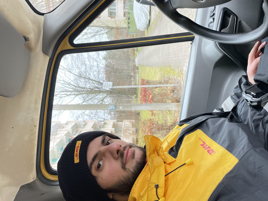 A young adult male, identified as a DHL employee, is depicted seated in the driver's seat of a delivery van