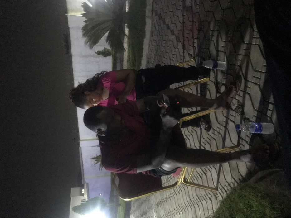 An outdoor nighttime scene in Bwari, Nigeria, depicts two individuals on a paved area with interlocking bricks. A dark-skinned male, wearing a red short-sleeved shirt and dark shorts, is seated on a gold-framed chair with a red cushion. He is looking down at a mobile device held in his left hand, while a red glow, possibly from a cigarette or ember, is visible near his right hand. He wears flip-flops on his feet. Standing immediately behind and to his right is a lighter-skinned female with long dark curly hair tied in a high ponytail. She wears a bright pink short-sleeved top and dark trousers, and is also looking downwards in the direction of the male's actions. Two plastic water bottles with blue labels rest on the paved ground. The background features a low white wall, beyond which a building is partially visible on the left. Green grass and various plants, including a palm-like plant and a conical shrub, line the edges of the paved area. Artificial light sources illuminate the scene, casting shadows.