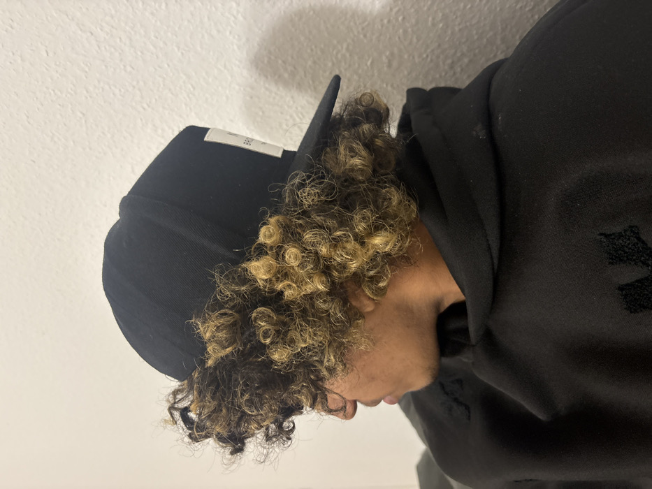 A person wearing a black hooded sweatshirt and a black baseball cap with a light-colored tag is visible in a low-angle shot. The individual's curly hair has blonde and brown tones. Only the person's profile from the nose down is visible, suggesting a downcast or thoughtful expression. The background consists of a plain white wall.