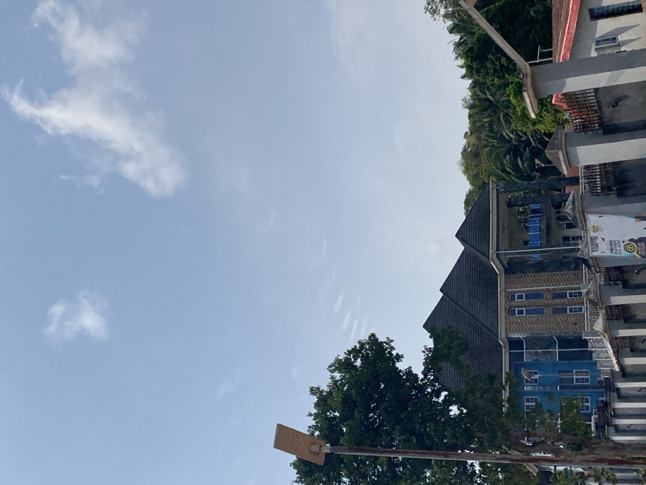 The image depicts a daytime scene in Ufueseni, Nigeria, under a clear, light blue sky with sparse white clouds