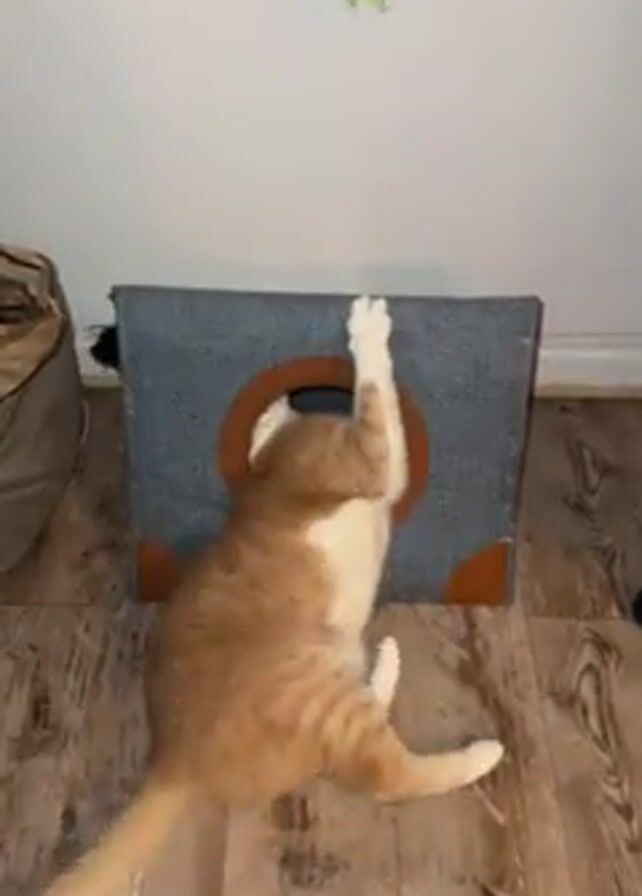 n orange tabby cat reaching into a gray square cat toy with a circular opening in the center