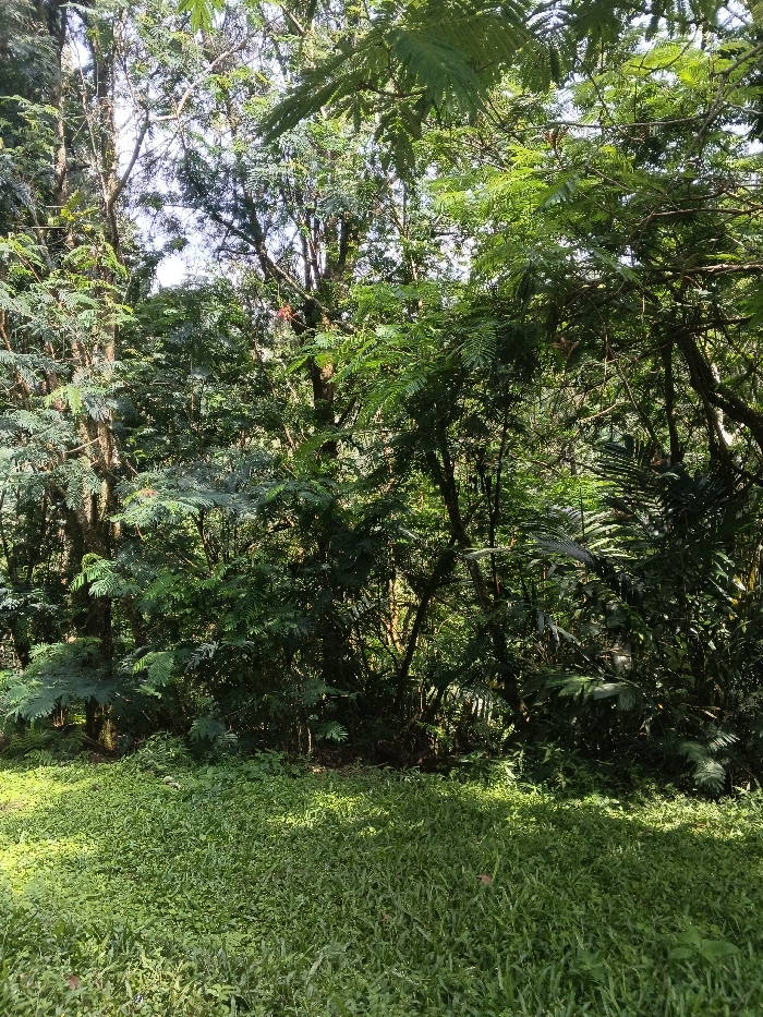 A dense forest scene is captured in bright daylight