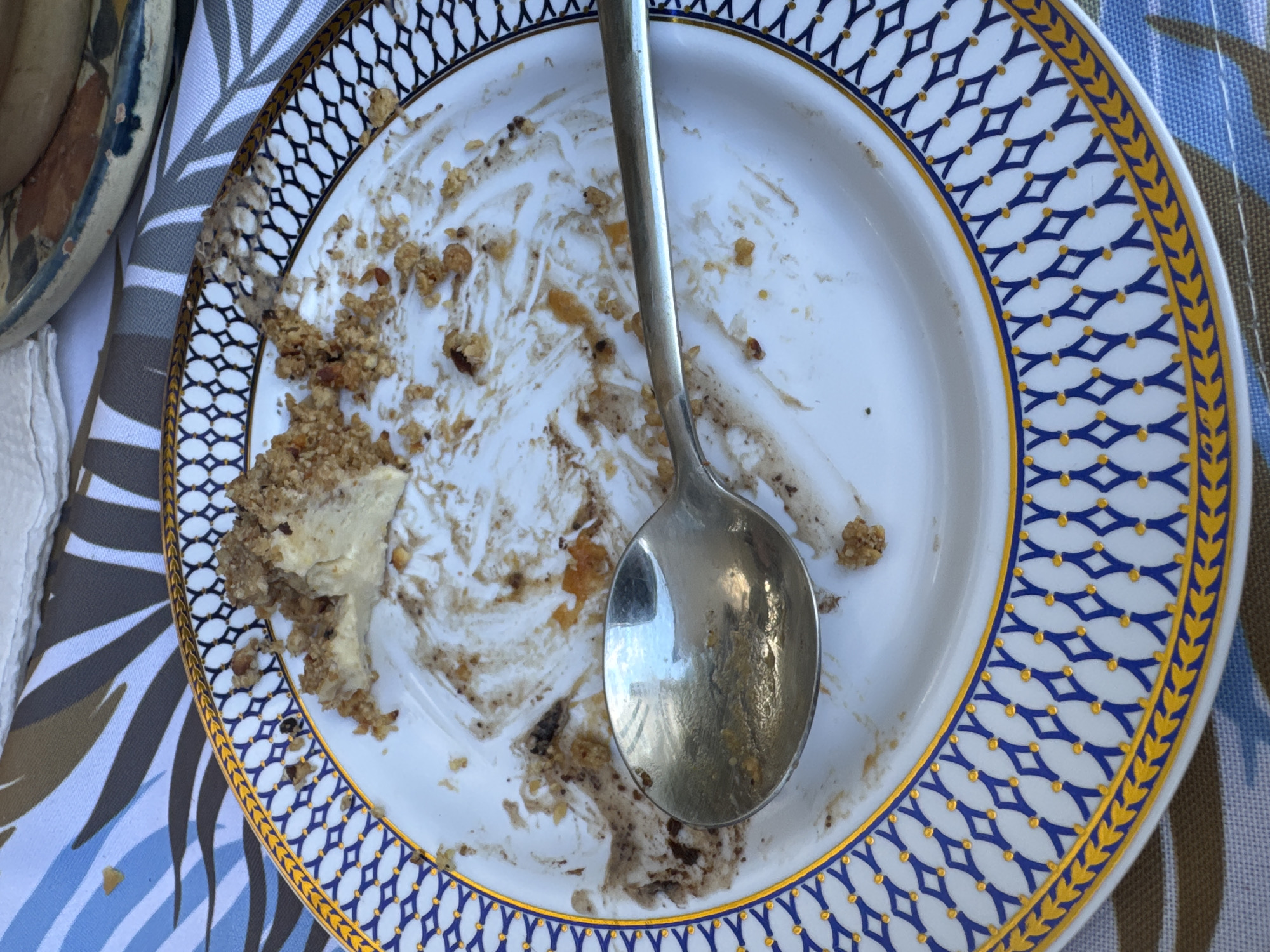 A partially eaten dessert is on a white plate with a blue and gold patterned rim. A silver spoon rests on the plate amongst the remaining crumbs. The plate is on a tablecloth with a patterned design. The location is Oaxaca City, Mexico.