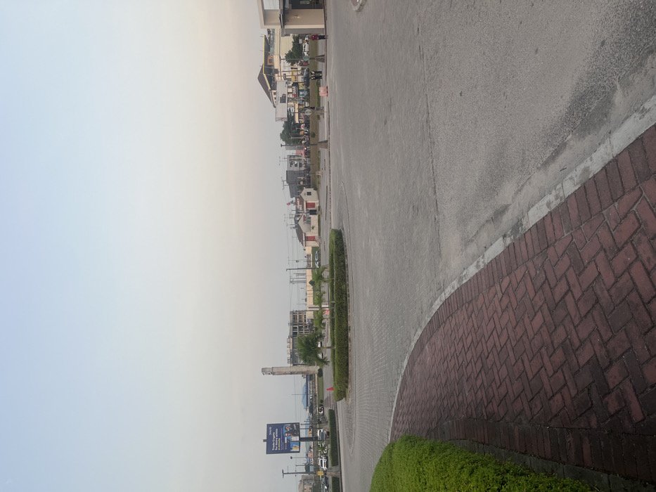 A road and a brick walkway are prominently featured. The road, composed of gray asphalt, extends into the distance alongside buildings and billboards. The walkway is composed of herringbone-patterned red bricks, bordered by green bushes. The sky is overcast, lending a muted tone to the overall scene.