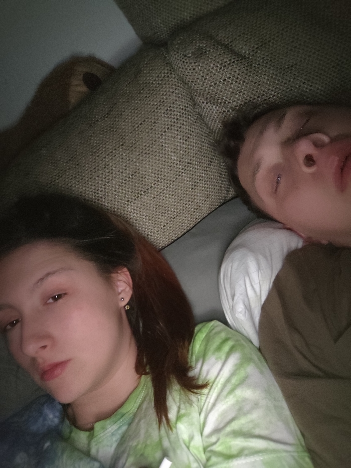 An indoor scene in Leidersbach, Germany, depicts two individuals in a resting or reclining position. In the foreground, a female subject with reddish-brown hair pulled back is positioned on the left, looking directly towards the camera with a neutral expression. She wears a green and white tie-dye shirt, and a small stud earring is visible in her left ear. To her right, a male subject is partially visible, lying on a white pillow with his eyes closed or partially closed, suggesting he is asleep or deeply resting. He wears a brown shirt. The subjects are situated against a background that includes a textured, light brown or beige upholstered surface, likely a couch or headboard, occupying the upper portion of the frame. A portion of a brown plush object, possibly a teddy bear, is visible behind the upholstered surface in the upper left. A dark blue fabric is partially visible beneath the female subject. The lighting is dim throughout the scene.