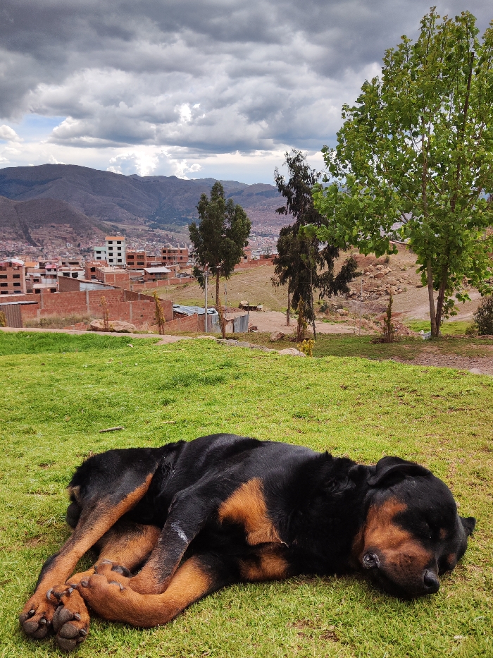 A Rottweiler dog sleeps peacefully on a vibrant green lawn. The dog has black fur with tan markings on its legs and face. Behind the dog, the scene opens to a hilly landscape, partially covered by a town with red-brick buildings and mountains in the distance, under a cloudy sky. Several trees are visible on the hillside.