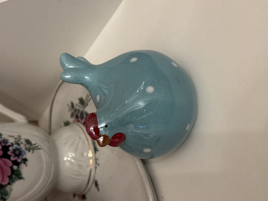 A static indoor scene in the city of Zelenogradskiy, Russia, displays multiple ceramic objects on a light-colored shelf. In the foreground, a glossy, teal-blue ceramic chicken figurine with white polka dots is positioned, facing left. The figurine features a prominent red comb and wattle, a small orange beak, and a black dot representing an eye. Its tail is raised and bifurcated. Behind and to the left of the chicken, a white ceramic teacup, or similar vessel, with fluted details and a gold-painted rim on its base, is partially visible. This vessel rests on a white ceramic saucer, also partially visible, adorned with a floral pattern consisting of pink, purple, and blue flowers with green foliage.