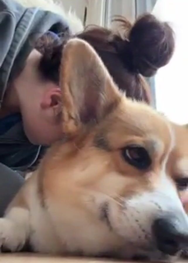 A woman with her hair in a bun is crouching close to the floor, petting a tan and white Corgi dog. The dog is lying down on the floor, looking to the right of the frame with a somewhat sleepy expression. The woman is wearing a grey hooded jacket and a blue shirt. The floor appears to be made of wood. A window is visible in the background. The woman's face is not fully visible.