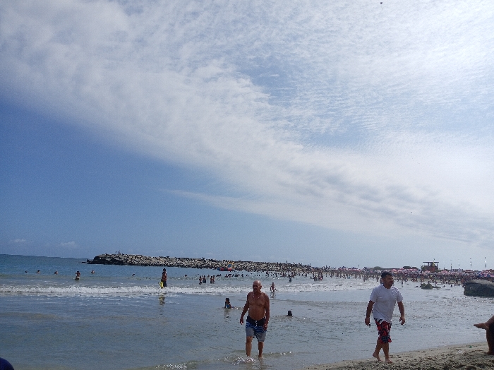 This image depicts a crowded daytime beach scene in Caraballeda, Venezuela. The upper portion of the frame features a light blue sky with extensive, horizontally stretched wispy white clouds. The foreground shows shallow ocean water with small breaking waves and wet sand. Two adult males are prominent in the foreground. On the left, a shirtless man with a light complexion, wearing blue and white patterned swim trunks, wades in the water, facing towards the shore. To his right, another man with dark hair, dressed in a white t-shirt and red, white, and blue patterned swim shorts, walks on the wet sand, facing left. A child is partially submerged in the water between these two individuals. In the mid-ground, a long, rocky breakwater extends into the ocean from the right side of the frame, populated by numerous people. Beyond the breakwater and further along the beach to the right, a large concentration of colorful beach umbrellas (red, blue, yellow, white) indicates a substantial crowd gathered on the sand. A raised, open-sided structure, possibly a lifeguard stand, is partially visible on the far right beach amidst the umbrellas. Numerous other individuals are scattered throughout the ocean, swimming, wading, and standing.