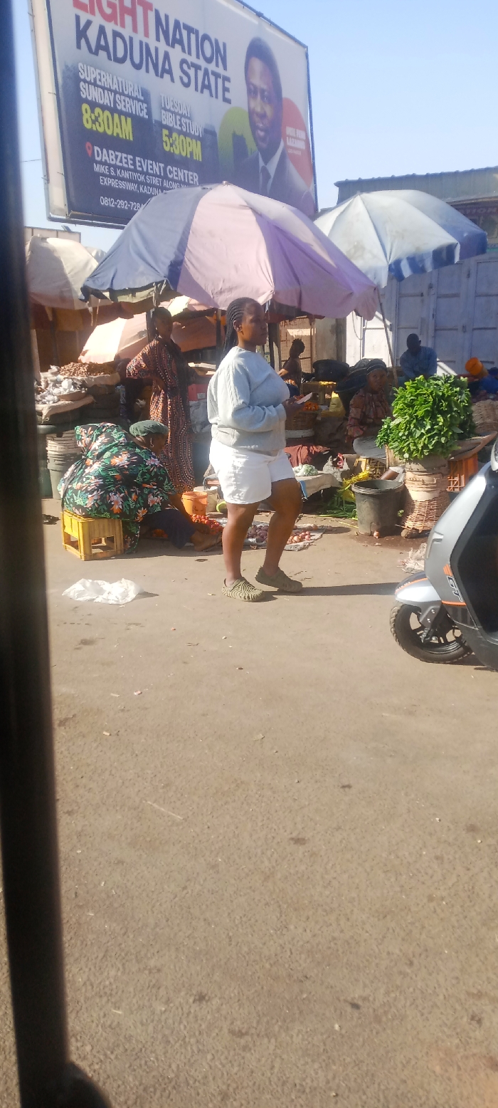 The image depicts an outdoor market scene in Sabon Tasha, Kaduna State, Nigeria, identifiable by a prominent billboard in the upper background