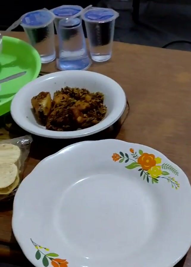Here is a detailed description of the video: The video begins with a close-up shot of a wooden table set for a meal. Several glasses of water, covered with plastic wrap and straws, are on one side of the table, next to a white bowl filled with food that appears to be chicken and spices. An empty white plate with an orange floral design sits in the foreground. The camera pans to reveal more items: a green plastic tray holding a white bowl of soup and a small plate of what looks like chili sauce. Two bags of crackers, one containing light-colored tubular snacks and the other containing flat, round chips, are placed between the plates. A glass pitcher filled with a pink liquid sits in the background. The camera circles the table, showing additional empty glasses and chairs. A person wearing a black shirt reaches into the frame and begins scooping rice from a white bowl onto the empty plate.
