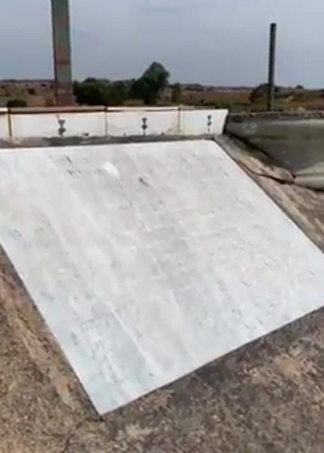 medium shot of a concrete structure with a white marble inclined plane on its surface
