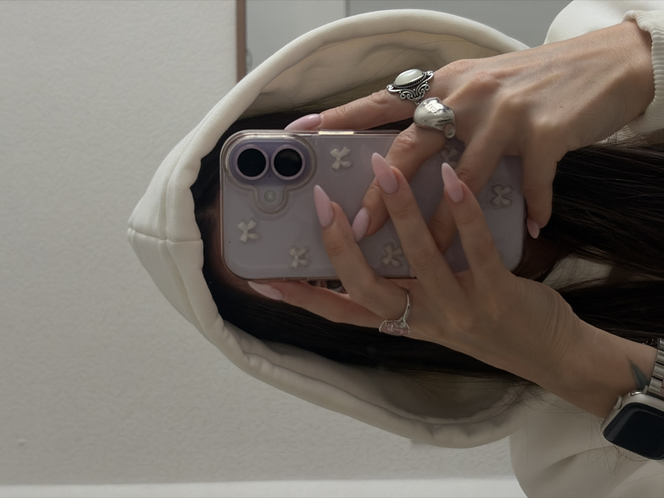 A person is captured from the chest up, obscuring their face with a light purple smartphone, in what appears to be an indoor environment. The individual is wearing a light-colored hooded sweatshirt, with long, dark hair visible under the hood. Both hands hold the smartphone vertically. The fingernails on both hands are almond-shaped and painted light pink. The left hand displays a silver-colored ring with a light, rectangular stone on the ring finger and a silver-banded watch with a dark screen on the wrist. The right hand wears three silver-colored rings: an ornate ring with a white oval stone on the index finger, a stylized figure-shaped ring on the middle finger, and a plain band on the ring finger. The smartphone case is light purple with small white bow patterns, and its dual camera lenses are visible. The background consists of a plain, light-colored wall on the left and a faint, blurry reflection of an indeterminate interior on the right. The image lacks any discernible features to identify the location as Novosaratovka, Russia.