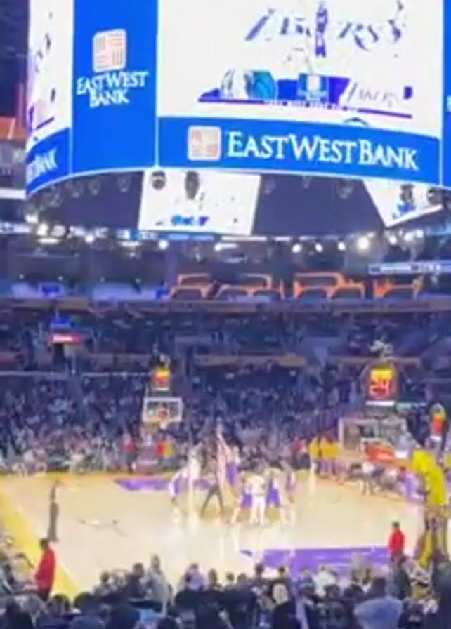 basketball game from the stands inside a crowded arena. Players in purple and gold uniforms are on the court. A large scoreboard hangs overhead, displaying the game score and advertisements for Crypto.com Arena and East West Bank. The crowd is primarily seated, and a man wearing a blue baseball cap walks in the foreground. A basketball is visible in the air as a player attempts a shot.