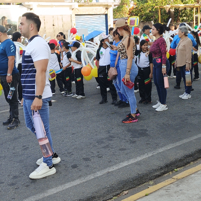 An outdoor scene in Tinaquillo, Venezuela, depicts a public gathering or procession on an asphalt street during daylight hours