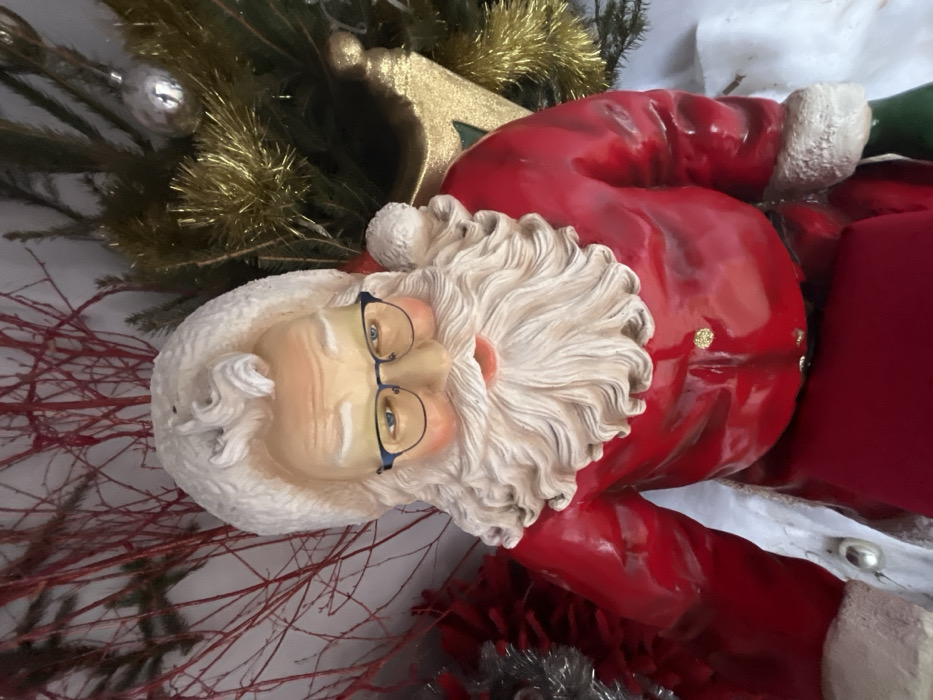 This image depicts a festive display located in Bagnoles de l'Orne Normandie, France. The central subject is a highly detailed, three-quarter view of a Santa Claus figurine, likely constructed from ceramic or resin, positioned slightly to the viewer's left. The Santa figure wears a red coat with sculpted white fur trim on the collar and cuffs, and small gold buttons on the front. He has a full, white, sculpted beard and mustache, rosy cheeks, and wears dark blue, rectangular-framed eyeglasses positioned on his nose. His gaze is directed downwards and to the left. The background behind the Santa figurine consists of various Christmas decorations. To the left, thin, red, bare decorative branches are visible against a light background. To the right, a section of an artificial evergreen branch adorned with gold tinsel and a silver spherical ornament is present. A glittery gold object, possibly part of a sleigh, is partially visible behind Santa's right shoulder. A white, draped material, resembling artificial snow, forms the base around the figure, with another small silver ornament visible on it near Santa's left arm.