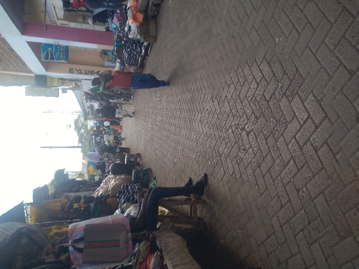 A bustling marketplace scene is captured in this angled shot. Paved in a herringbone pattern, the ground leads to rows of vendors displaying clothing and goods. People mill about, browsing the stalls. One person sits in the foreground among the merchandise, while others are seen walking down the lane. Buildings line the sides, with signage visible on some. The atmosphere is lively, indicative of a busy shopping day.