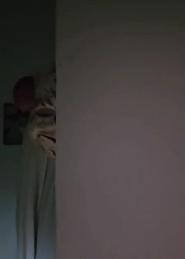 A close-up, slightly blurry, vertical video shows a scary clown mask peeking out from behind a white wall