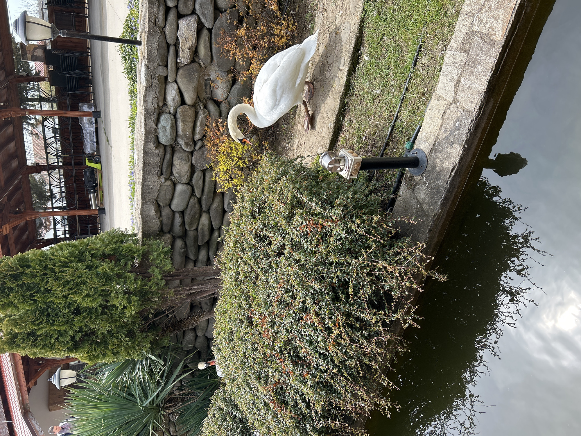 swan near a stone wall and a body of water. The swan is white with an orange beak. There is vegetation present, including bushes and a tree. A portion of a building with a wooden structure and outdoor seating is visible. A lamppost stands near the water's edge. The location is Skobelevo, Bulgaria.