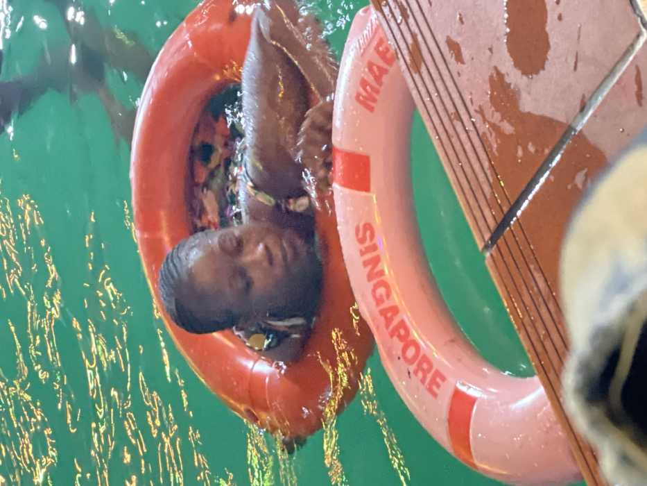 A person floats in green water, secured within a bright orange life preserver. The person's face is visible, eyes closed, with water droplets on their hair. Alongside the orange preserver is a light pink life preserver with "SINGAPORE" written on it, next to a reddish brown, possibly wooden, object with parallel lines. The scene appears to be lit artificially, with reflections shimmering on the water's surface.